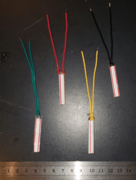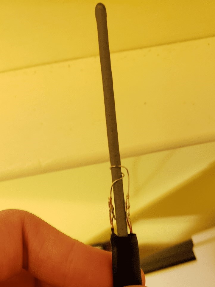 During our development we have used three different igniters. These can fall into two categories, straw igniters and sparkler igniters. Straw igniters are shown below to the left. These consist of a straw filled with a pyrolant that has a string of nichrome or filament extending into the pyrolant. The ends of the straw are sealed with hot glue or a similar adhesive. Sparkler igniters, shown below on the right, are simply sparklers with a piece of nichrome wrapped around it. In both cases the igniter is lit by an electrical current heating up the nichrome.
