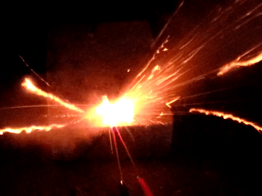 The straw igniters have proven to be more successful. The original design used a mixture similar to black powder as the pyrolant. The black powder would be lit, and build up pressure in the straw until bursting. The hot gasses released not only light the grain, but pressurize the chamber This method, while better than the sparkler igniters, still had ignition times in the range of 10 seconds. The most successful igniter has been using a pyrolant developed by Richard Nakka known as MDP. This pyrolant is similar to the composition of the fuel grains, but replacing some of the fuel with sulfur and iron ixode particles (visit https://www.nakka-rocketry.net/igniter.html#MDP for more details). This reacts into a mixture of hot gasses and hot reacting metal particles. These two products work in conjunction to light the grain quickly and evenly. Slots are also cut in the side of the straw igniter so instead of the straw bursting from pressure, it shoots the products out the side to provide sustained heat to the grain during ignition time. Average ignition time including startup transient for the MDP straw igniter is usually under 3 seconds. A picture of the igniter being tested is shown below. Note both the presence of hot gasses as well as additional metal particles.