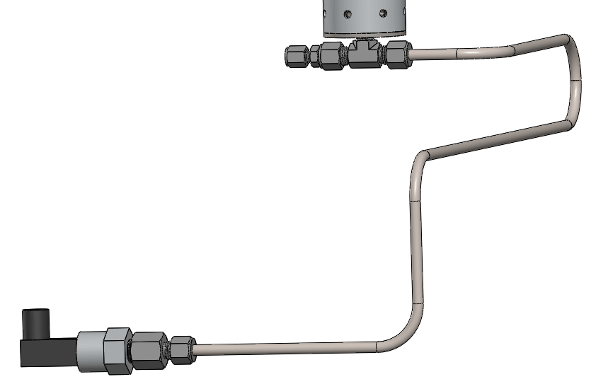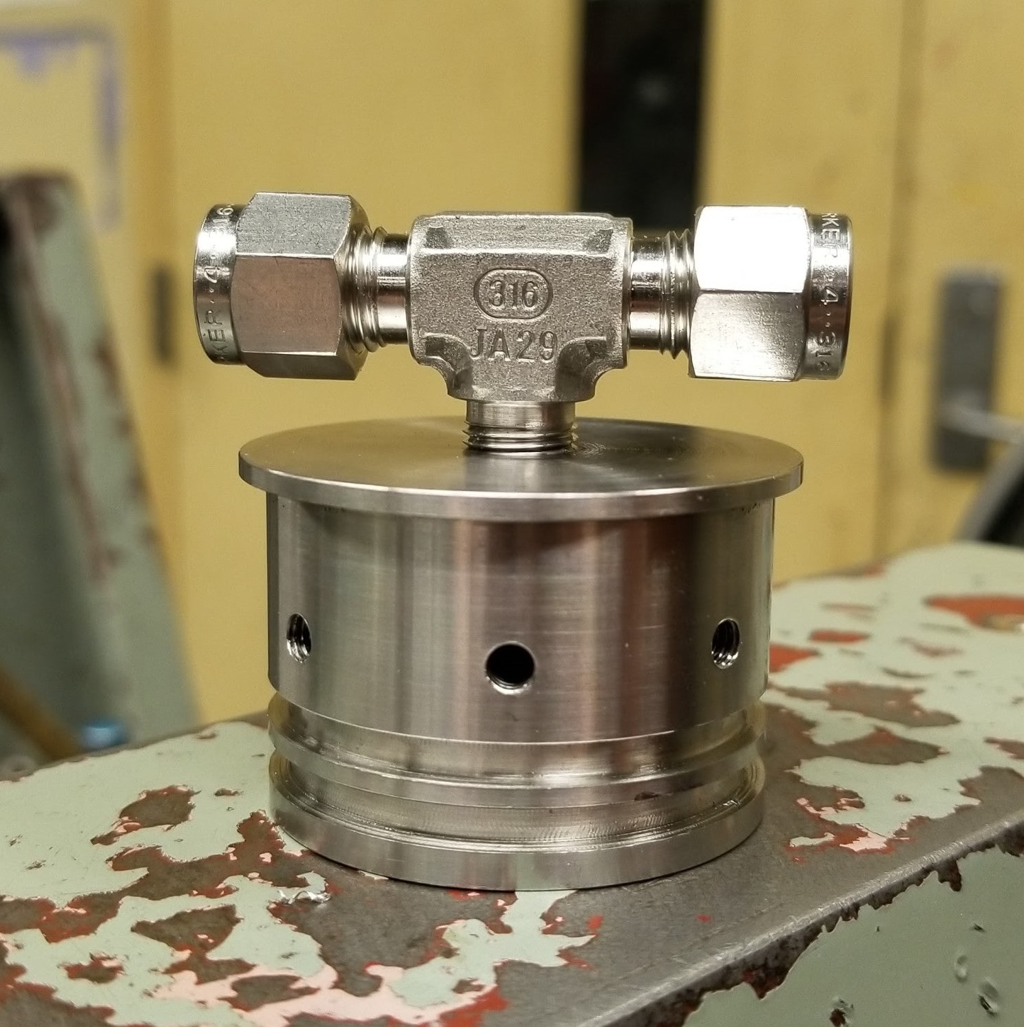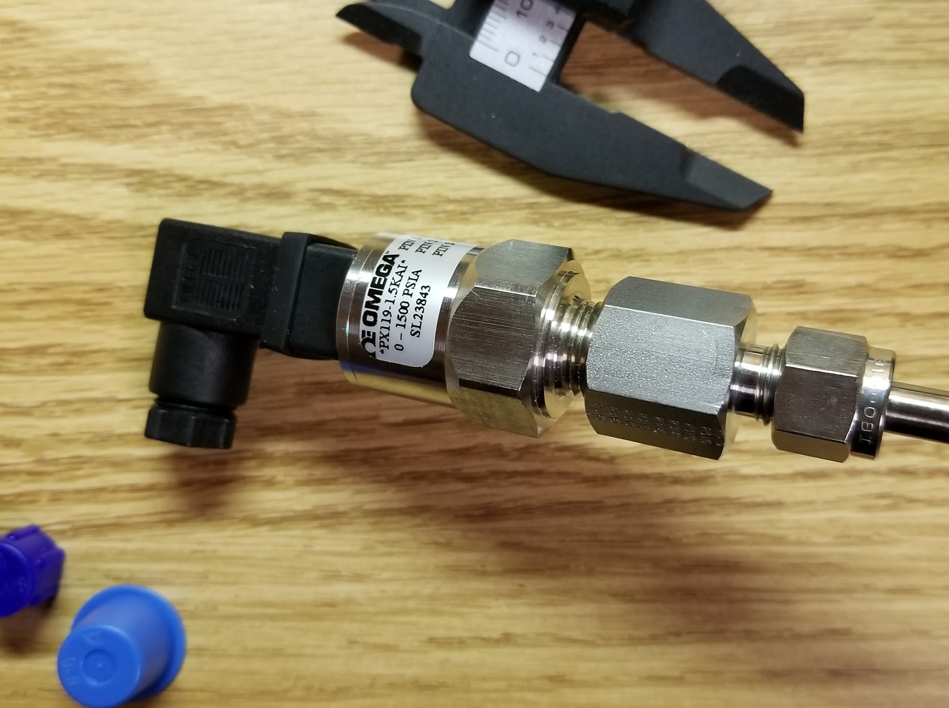 A new bulkhead was machined with a port for the pressure transducer and thermocouple. A tee screws into this port and splits off for the tube and pressure transducer to connect to.