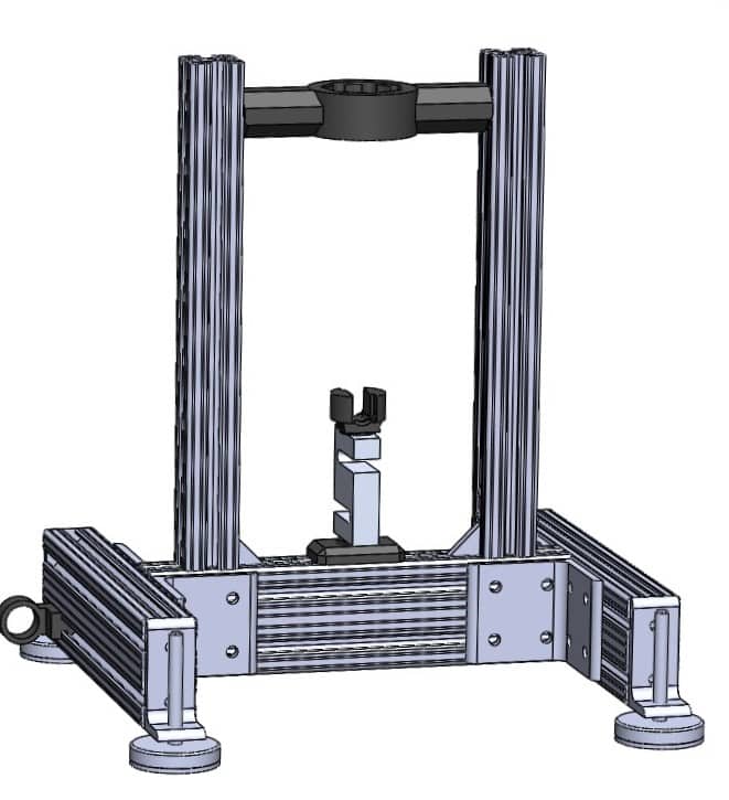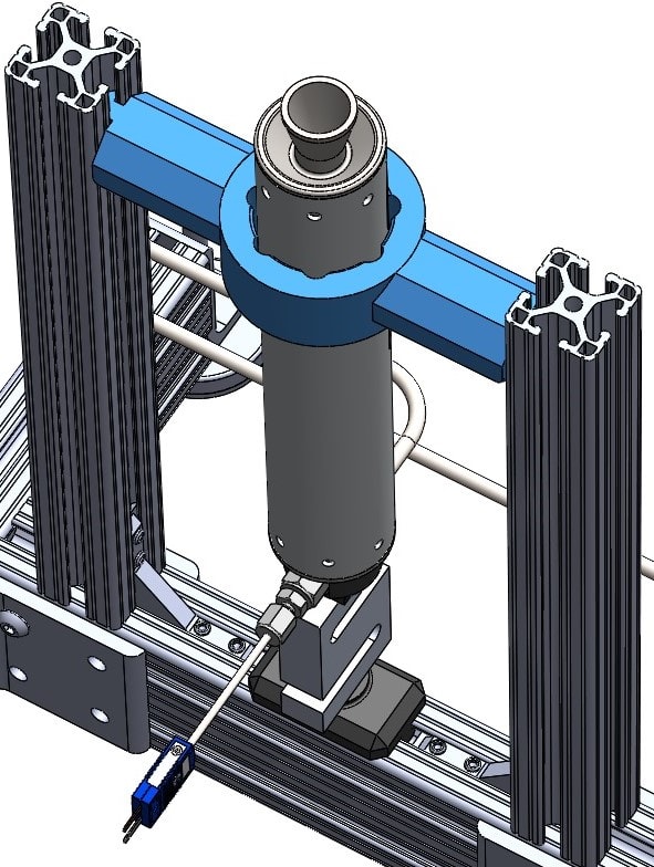 The goal of the frame is to hold the motor securely and provide mounting locations for sensors. The frame was made largely of aluminum extrusion for its ease of use and affordability. One key feature of the thrust stand is the motor’s vertical configuration with the thrust vector pointed toward the ground (flamey end up). This eliminates the need for heavy ballasts to anchor the stand.