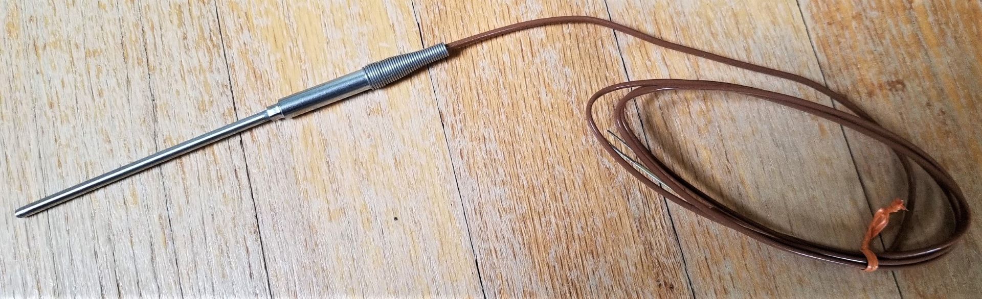 The thermocouple is used to measure the temperature of motor combustion gasses. A K-type thermocouple was chosen for its low cost and wide recording range (−200 °C to +1350 °C). Probe diameter affects response time, so a 0.125in probe was chosen to be fast enough for motor temperature variations. The thermocouple mounts into the bulkhead in a similar way to the pressure transducer, and produces a voltage due to the thermoelectric effect. This tiny voltage is read by the data acquisition box.